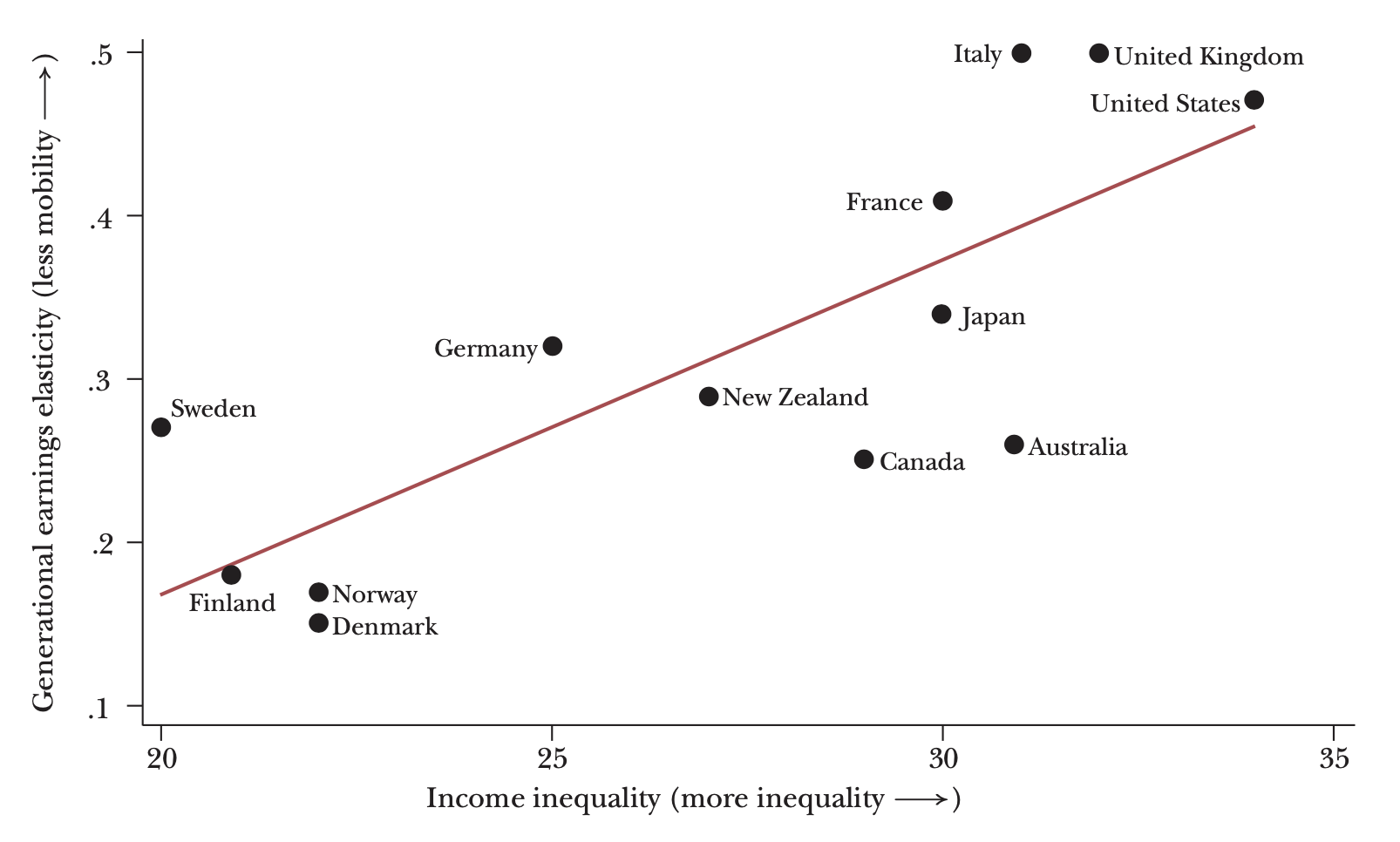Intergenerational earnings elasticity: \(\beta\) \[log~y_{ic} = \alpha + \beta~y_{ip} + \varepsilon_{ic}\] Intergenerational earnings correlation: \(\rho\) \[\rho = \beta~\frac{\sigma_p}{\sigma_c}\] with \(\sigma\) being the standard deviation.
