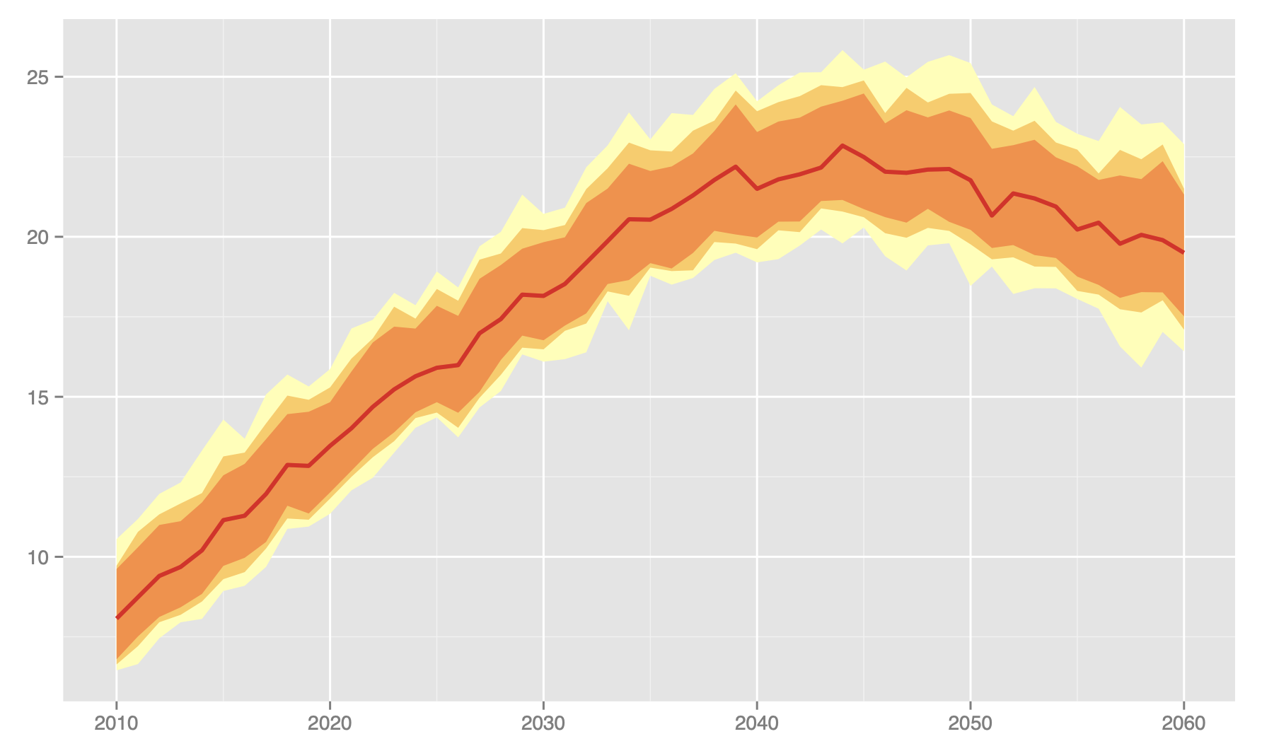 The table shows the median and a confidence interval (P5 and P95) of a projection based on 100 simulations.