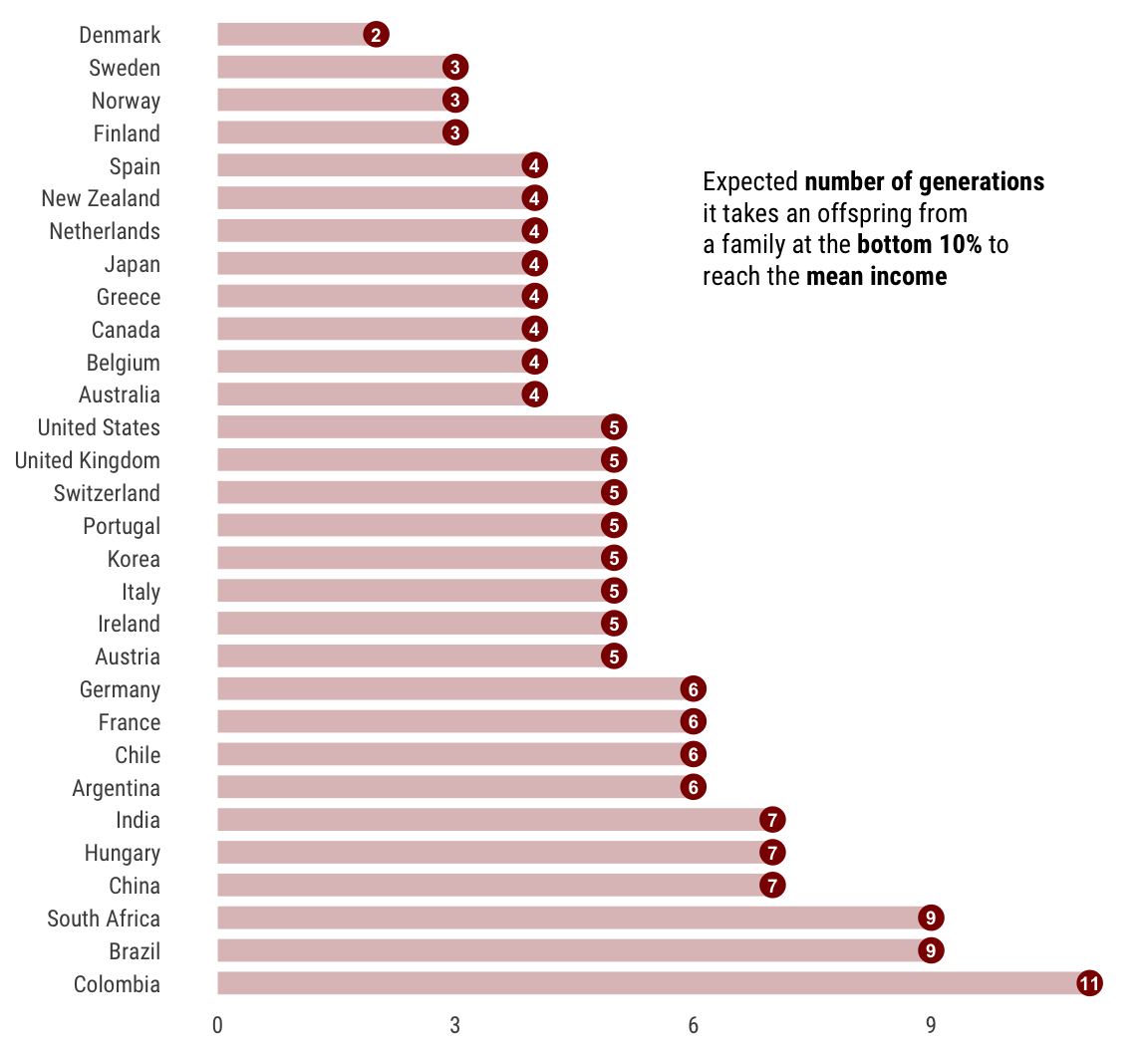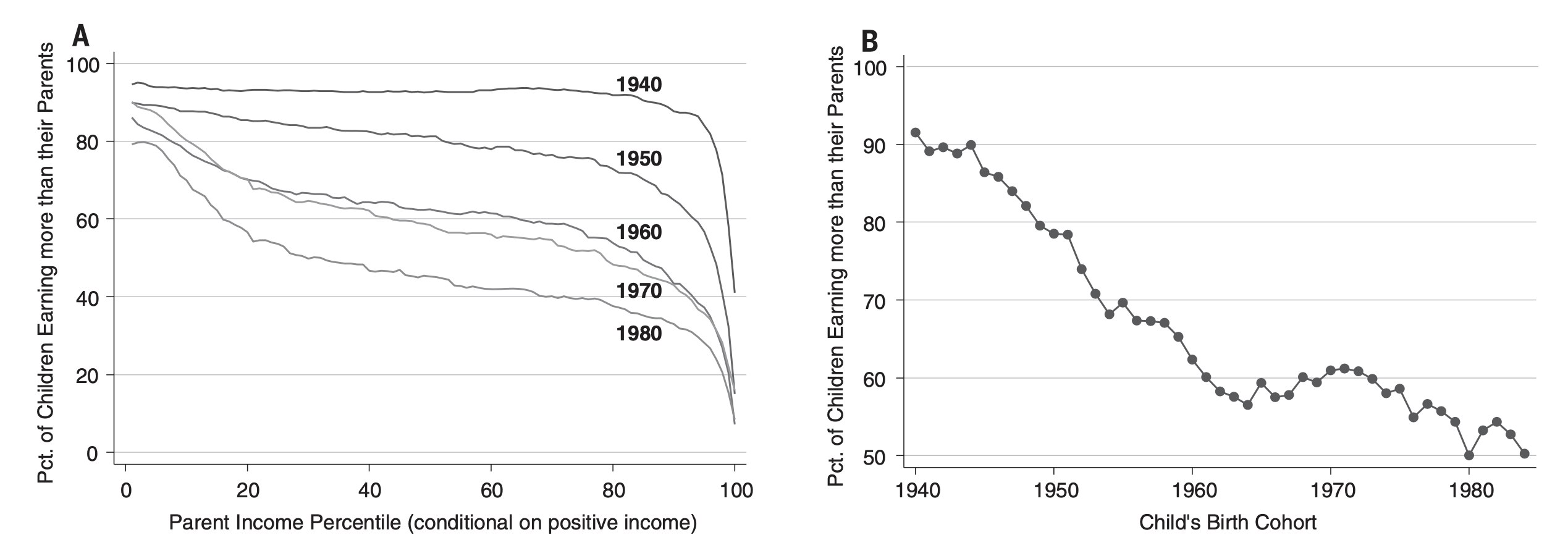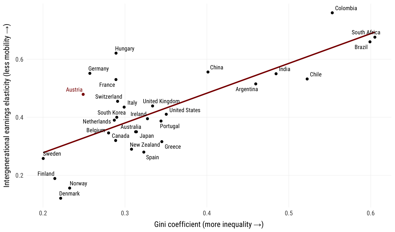 Intergenerational earnings elasticity: \(\beta\) \[log~y_{ic} = \alpha + \beta~y_{ip} + \varepsilon_{ic}\] Intergenerational earnings correlation: \(\rho\) \[\rho = \beta~\frac{\sigma_p}{\sigma_c}\] with \(\sigma\) being the standard deviation.
