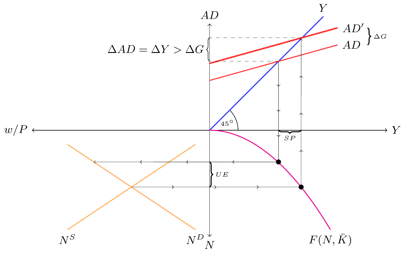Total multiplier: \[ Y^* = 1/(1 - 0.6 + 0.6 \cdot 0.3) \simeq 1.7 \]